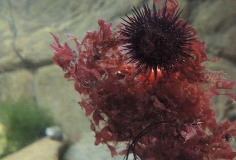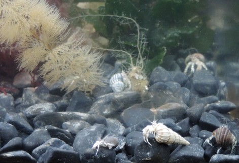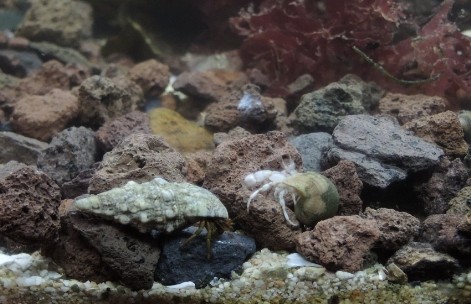 Hier einige Bilder aus zwei experimentellen Kleintierbecken, bei denen das eine Becken ein 50er Becken mit 45 Litern, das andere ein 60er Becken mit 54 Litern ist. Beide Becken laufen mit Teilsubstraten aus dem Watt und echtem Meerwasser; über der etwa 4 Zentimeter hohen feinen Sandschicht wurde im linken Becken etwas schwarzer Basaltsplit, im rechten dagegen Lava aufgeschüttet. Beide Becken sind mit aquarientauglichen künstlichen Felsrückwänden ausgestattet. Die Becken laufen bereits jeweils etwas über ein Jahr. Darin tummeln sich Strandigel (Psammechinus miliaris) aus der Nordsee und Steinseeigel (Paracentrotus lividus) aus dem Mittelmeer, Zwergeinsiedler (Diogenes pugilator) aus der südlichen Nordsee und Felsenküsteneinsiedler Clibanarius spec. aus dem Mittelmeer. Darüber hinaus gedeihen hier hier ein paar Rotalgen der Gattung Rhodophyllis; die anderen Algen dienen haupsächlich als Futter für die Seeigel und die Einsiedler. Im anderen Becken sind auch noch ein paar kleine Grundeln aus der Nordsee, im linken Becken einige Felsengarnelen (Palaemon spec.) aus der Nordsee. Außerdem sind im Becken rechts auch noch 5 Putzergarnelen der Art Lysmata seticaudata aus dem Mittelmeer. Diese kleinen Tiergemeinschaften funktionieren auch recht gut, auch wenn ich heute beobachten konnte, wie sich im Becken links meine Gespensterkrabbe (Macropodia spec.) an einem kleinen Seestern vergreifen wollte. Ach ja: Links der Nordsee-