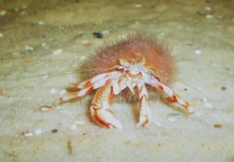 Der Stachelpolyp Hydractinia echinata hat meistens eine rötliche oder sogar violette Färbung. Die einzelnen Polypen der Kolonie können in ausgefahrenem Zustand etwa 5mm Länge erreichen und bilden dünne filzige Überzüge auf Schneckengehäusen, welche von Einsiedlerkrebsen bewohnt werden. Insbesondere der Bernhardskrebs Pagurus bernhardus kann oft mit dem Stachelpolypen angetroffen werden. Bei dieser Beziehung von Krebs und Polyp handelt es sich um eine echte Symbiose mit Nutzen für beide Partner. Der Stachelpolyp täuscht durch Schleim und Nesselgifte den Feinden des Einsiedlers Ungenießbarkeit vor, während der Polyp als Gegenleistung feinste Futterreste des Krebstieres verwerten kann. Das Interessante ist jedoch, dass sich der Stachelpolyp aus kriechenden Planula-