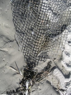 Well, especially on such exposed beaches as those on the island Borkum, you can often find such grids with different mesh sizes. Especially mussel farmers from the Netherlands use them in their aquacultures. If they get loose in the environment, they play an ambivalent role. On the one hand, various invertebrates can settle on them, but on the other hand, animals like sea-